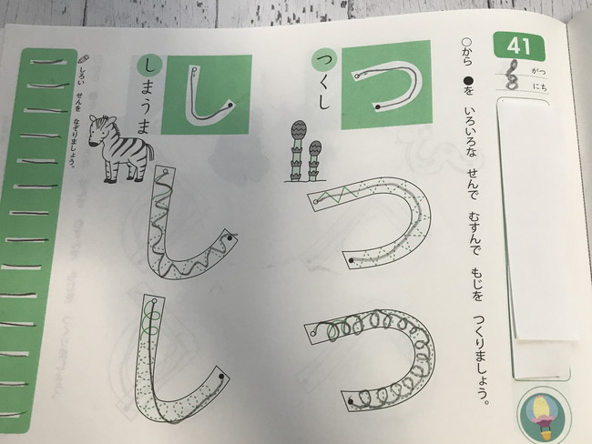 鉛筆の持ち方と姿勢が整ったら文字の練習開始です。早速ひらがなから???いえいえ、いきなり子供がひらがなを書くというのは、大人が考えているよりはずっと難しいそうです。