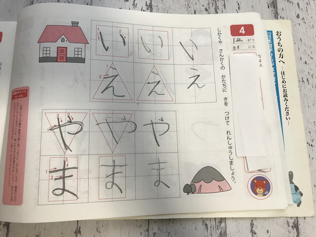 ひらがなの練習は紙と鉛筆があればできるので、無理に教材に頼ることもないのかもしれませんが、教材を買うにしても、ノートで練習するにしても日付を忘れずに書いておくといい記念になります。日付必須です!