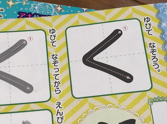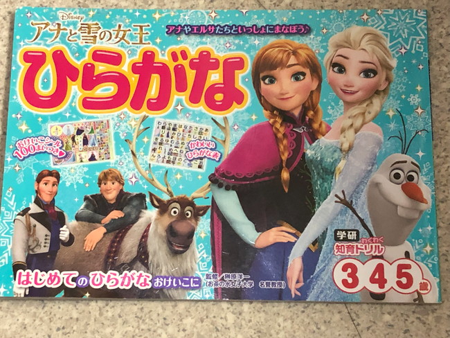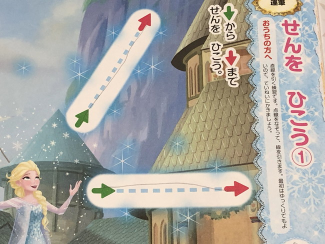 うちの子は、エルサが大好きだったので、アナ雪の練習帳にしましたが、こちらの教材に関しては、線を引く練習が少なく、すぐにひらがなの練習に入っていくスタイルだったので、就学前だとちょっと難しかったです。うちの場合は、結局年長さんでは使いきれず、小学一年生になってからも引き続き使っていました。
