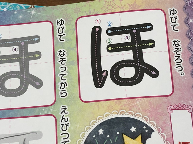 書きやすい文字の練習の次に、「は」「ほ」「を」などの難しい文字の練習になります。小さいうちは、少々字の形がとれていなくても、 直すかどうかは子供次第。 親から声がけをして、修正させる必要はあまりないと思います。