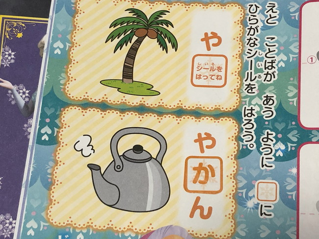 右下に付属シールが貼れるようになっています。一頁終わったら、ご褒美のシールを張ります。このシール貼りが子供にとっては最も楽しみな作業でした。
